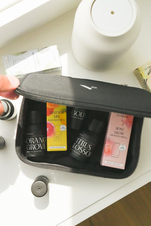 Ideal for holding your oils, toiletries, or other small items, this fabric zip-up cube is sleek and compact. Great for at-home storage or grab-and-go travel. Note: this item is final sale.